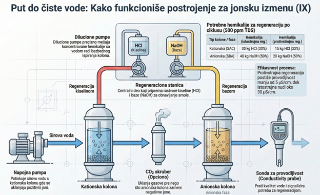 Ako ovaj CO2 ne uklonimo fizički, on bi ušao u SBA kolonu. Pošto je SBA smola dizajnirana da uklanja sve anjone, ona bi „trošila“ svoj kapacitet na vezivanje CO2, što bi značilo ogromnu potrošnju natrijum-hidroksida (NaOH) i veoma česte regeneracije. Degazator uklanja taj teret praktično besplatno (koristeći samo vazduh).